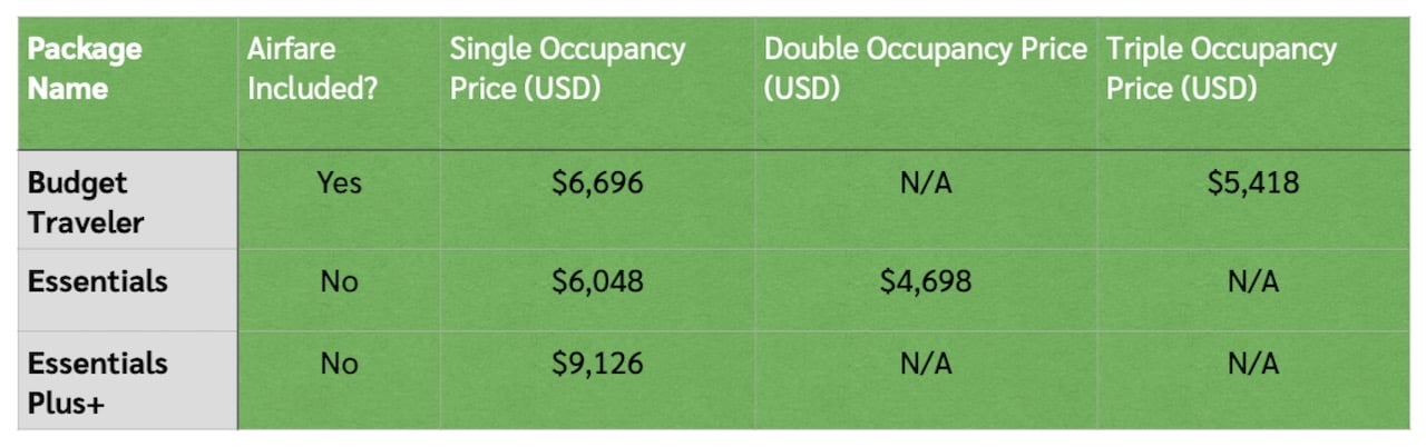The Budget Traveler package includes airfare. Pricing for this package begins at $5,418 USD*. There are a limited number of these packages available up to a certain time prior to the trip, so be sure to book early before they are sold out. Click here for more information about this package. Other restrictions may apply.